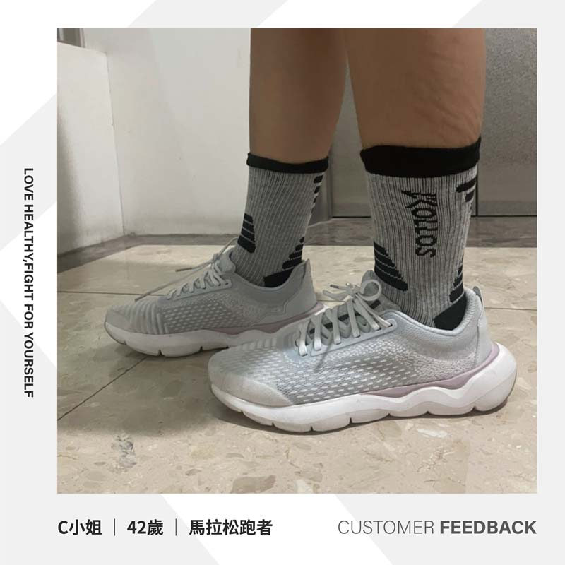 一定要推薦這一款護芯襪,主要是阿基里斯腱的保護真的很專業,而且抗菌又消臭。整雙襪子有不同針織紋理設計,讓我雙腳被舒適的包覆,又不會過緊,而且襪底加厚的效果也超棒的,對於我這種熱愛馬拉松的跑者來說,一雙好襪子更是助力我跑下去的好夥伴。