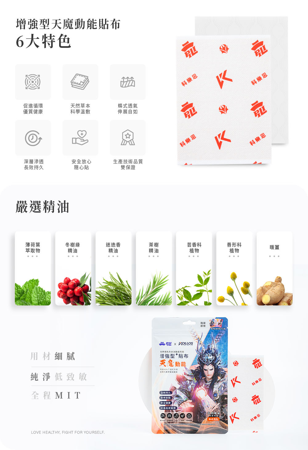 (增強型)遠紅外線粉末、薄荷葉萃取物、冬綠樹精油、迷迭香精油、茶樹精油、鐵拳頭、老薑、樹脂、棉布。